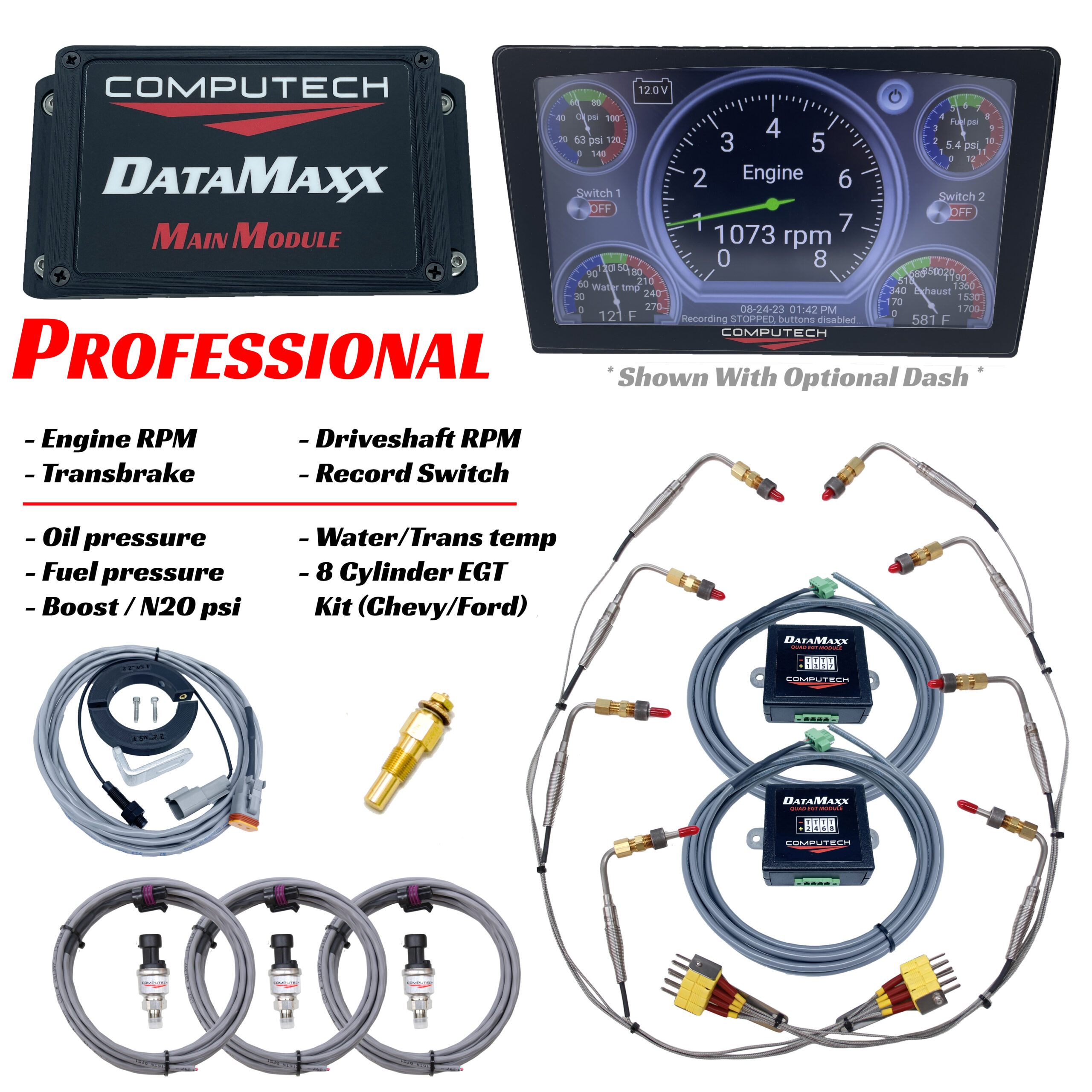 There are a couple of predefined kits we have put together to make life easy on you. The Bracket Kit features water, fuel, oil and 1 EGT. The Sportsman Kit has fuel, oil and dual O2 sensors. The Professional Kit steps it up with fuel, oil, accel, boost or nitrous, and 8 EGT’s. You can also add the LCD Dash Display to any of these kits now or anytime you’d like in the future. If you would like more sensors than what the existing kit has you can simply get the Analog Expansion Module and have room for 4 more sensors. All of the kits include the Main Module, engine RPM, driveshaft RPM, battery voltage, 2 switch monitors, 2 led light outputs, record switch, 2 sd cards, DataMaxx software, a comprehensive and easy to follow instruction manual and evening and weekend customer support that you can count on. If you have any questions feel free to call us anytime at 1-800-870-8383 or simply click the Chat With Us button at the bottom of your screen.